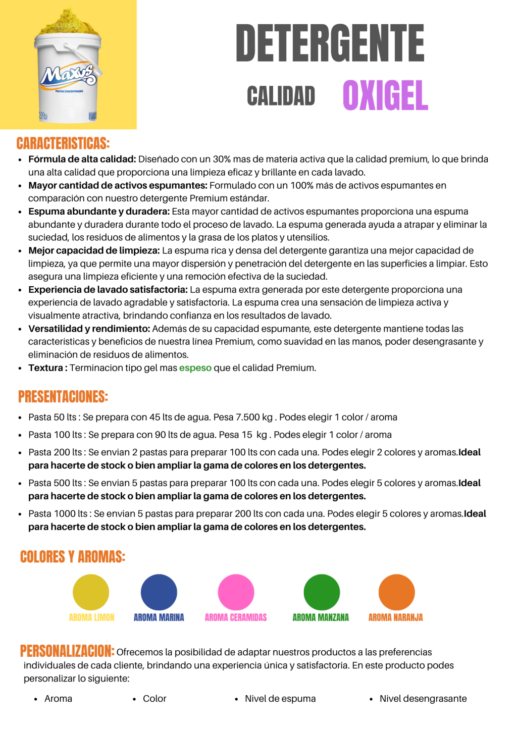 MAXUS DETERGENTE OXIGEL contiene un 30% mas de agentes de limpieza en relación al Detergente premium , que te ayudan en la limpieza diaria de tu vajilla, removiendo la grasa y la suciedad logrando un resultado brillante y un desengrase total de tus platos, dandole una terminacion mas espesa, en comparacion al Detergente Premium ..Posee mayor cantidad de activos espumantes , lo que proporciona espuma abundante.Además ayuda al cuidado de tu piel, a la hora de lavar los platos, el DETERGENTE OXIGEL MAXUS resulta fundamental, ya que esta diseñado con materias primas biodegrables. Es la espuma que origina nuestro DETERGENTE OXIGEL MAXUS la que realmente quita la suciedad de la vajilla y remueve las bacterias que quedan de la carne, el pescado, salsas y todo tipo de restos de comida.Una vez fabricada la pasta , podes usarlo directamente en la esponja o diluí 1 cucharada en 3 litros de agua.